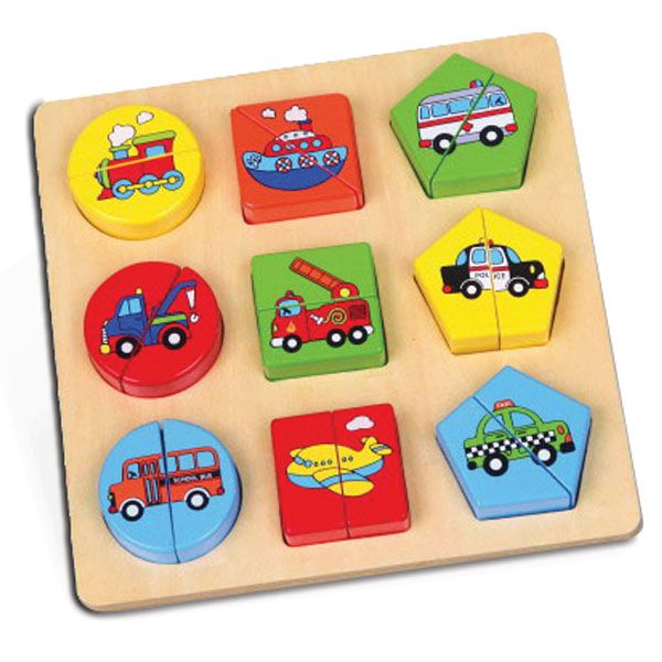 Edukativna slagalica umetaljka koja se sastoji od 9 dvodelnih drvenih puzzli sa motivima saobraćajnih sredstava koje se spajaju se u formu geometrijskih tela (3 oblika i 4 boje), a potom se umeću na odgovarajuća polja na drvenoj tabli. Dim. 20x20x2.5 cm. Uzrast: 2+